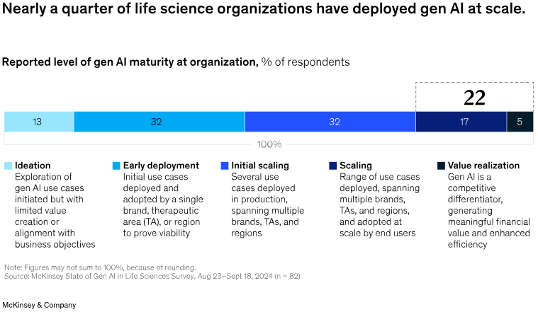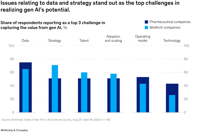 حدود ۷۵ درصد از پاسخدهندگان میگویند که سازمانهایشان فاقد چشمانداز جامعی برای هوش مصنوعی نسل جدید یا یک نقشه راه استراتژیک هدفمند با معیارهای موفقیت مشخص و مرتبط با اولویتهای تجاری هستند. در عوض، آنها تمایل دارند به صورت غیرمتمرکز و مورد به مورد پیش بروند. این غریزه برای کسب ارزش کوتاهمدت از طریق آزمایش، همراه با ساختار فدرال/عملکرد-محور بسیاری از سازمانهای علوم زیستی، بسیاری از چالشهایی را که سازمانها هنگام مقیاسبندی با آن مواجه میشوند، توضیح میدهد.