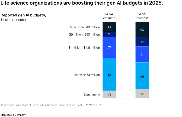 در ژوئیه 2023، محققان موسسه جهانی مککینزی تخمین زدند که هوش مصنوعی نسل جدید میتواند سالانه بین 60 تا 110 میلیارد دلار ارزش اقتصادی برای صنایع داروسازی و محصولات پزشکی ایجاد کند و بهرهوری و نوآوری را در حوزههای مختلف زنجیره ارزش صنعت – از نحوه کشف درمانهای جدید گرفته تا نحوه بازاریابی و تجویز آنها توسط پزشکان – افزایش دهد. شش ماه بعد، کارشناسان مککینزی عمیقتر به این اعداد پرداختند و بیش از 20 مورد استفاده با بیشترین پتانسیل برای تأثیر کوتاهمدت را کشف کردند.