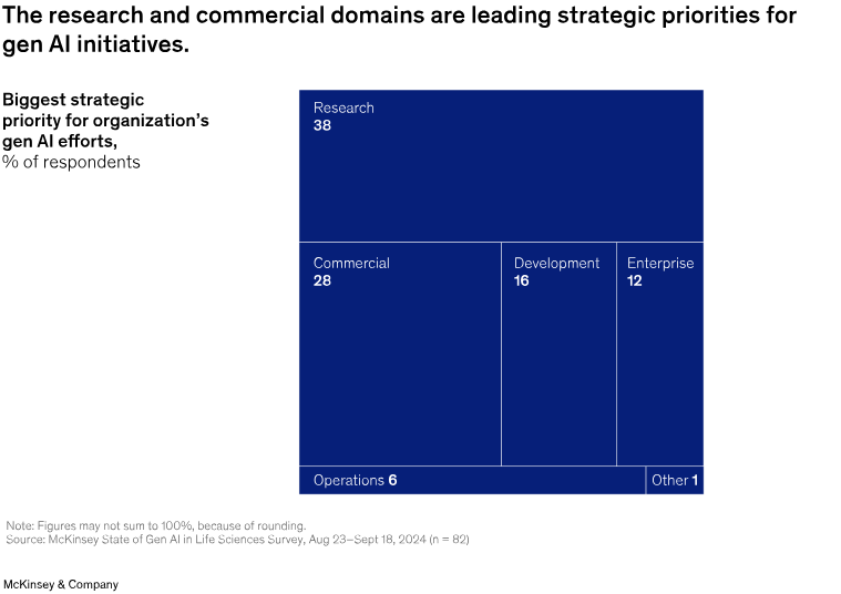 رویکرد درونمحور. استراتژی موفق هوش مصنوعی نمیتواند مبتنی بر انبوهی از موارد استفادهی غیرمرتبط باشد، که اغلب منجر به تلاشهای پراکنده و از دست رفتن فرصتها میشود. در عوض، تمرکز باید به سمت تحولات مبتنی بر حوزه تغییر کند، جایی که هوش مصنوعی نسل جدید برای تغییر شکل اساسی حوزههای حیاتی کسبوکار، مانند حوزههای تجاری، پزشکی یا تحقیق و توسعه، به کار گرفته میشود. سی و هشت درصد از سازمانهای علوم زیستی مورد بررسی، تحقیق را به عنوان اولویت استراتژیک اصلی خود در سفر هوش مصنوعی نسل جدید خود ذکر میکنند و پس از آن، حوزه تجاری با ۲۸ درصد قرار دارد (شکل ۴).